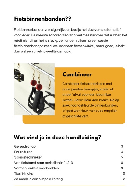 In deze handleiding van 13 pagina’s zet ik je op weg om zelf je juwelen te maken op basis van fietsbinnenbanden.